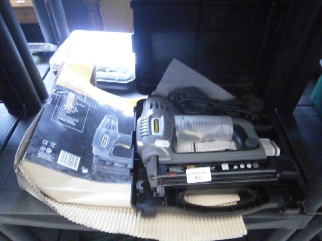 Grey and black electric staple gun with a yellow accent, power cord, and black plastic case, partially shown in a black and yellow cardboard box.