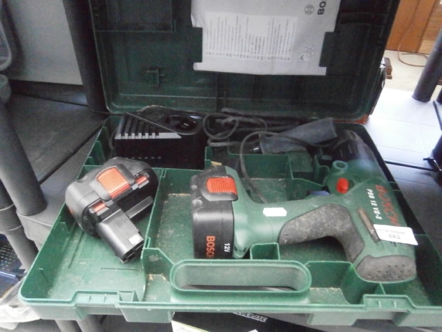 This lot features a Bosch PSB 12 VE-2 power drill with two battery packs, a charger, and its original case.