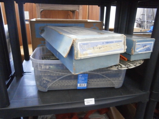 Two blue cardboard boxes containing Dublo model train accessories, including tracks and components, stored in a clear plastic container.