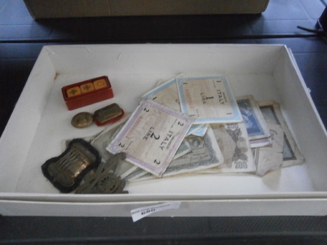 This lot contains assorted items including Italian Lira currency, medals, a model cannon, and other small collectibles within a box.
