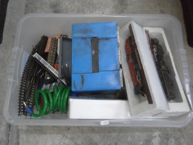 This lot contains model train tracks and two model locomotives, along with a blue box and a green coiled cable, all housed in a clear plastic bin.