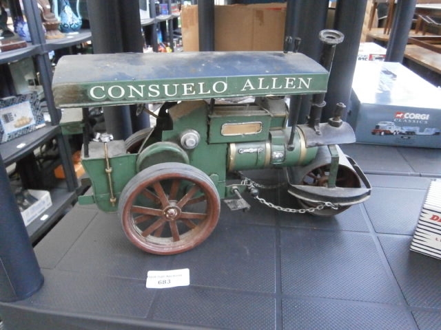 A wooden and metal model steamroller with green body, blue top, and visible wear.