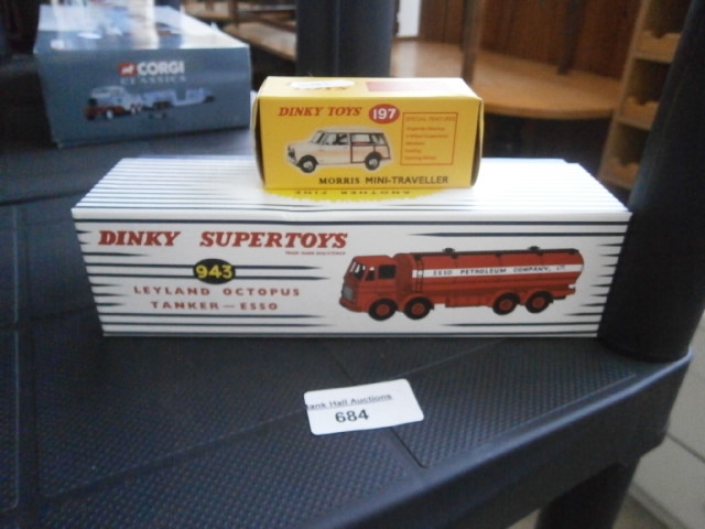 Two Dinky toy vehicle boxes, one for a Leyland Octopus Tanker and one for a Morris Mini-Traveller.