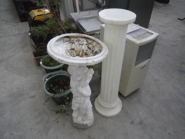 A white decorative pedestal with a fluted shaft and a circular top, accompanied by a white Honeywell air conditioning unit.