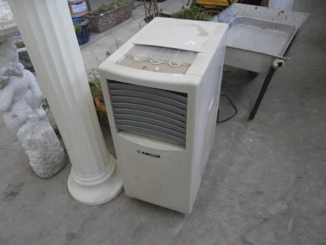An off-white plastic portable air conditioning unit with a gray louvered vent and three control buttons.