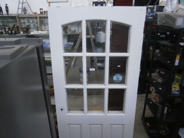 This is a white, interior wooden door featuring an arched top section with six glass panes and a lower section with two rows of six glass panes, above three solid panels.
