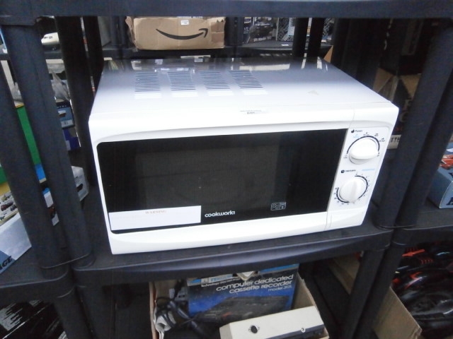 A white microwave oven featuring a black door with a tinted glass window, two rotary knobs, and a button, with a silver-colored vented panel on top.