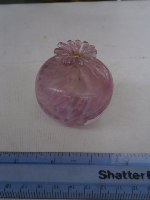 A round, pinkish-purple glass paperweight with a white marbled pattern and a clear glass floral embellishment.