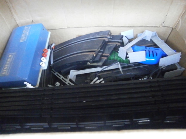 This lot features a Lincoln International slot car controller and multiple sections of black and gray slot car track, along with a blue slot car.