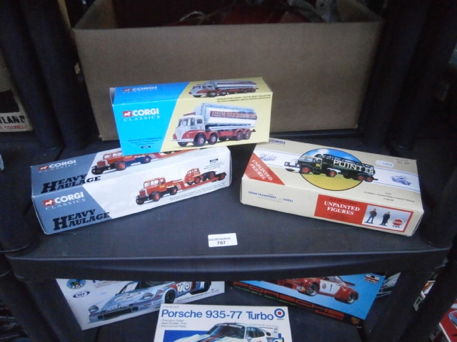 Collection of Corgi Classics model vehicle boxes, including tanker, tractor-trailer, and race car examples.