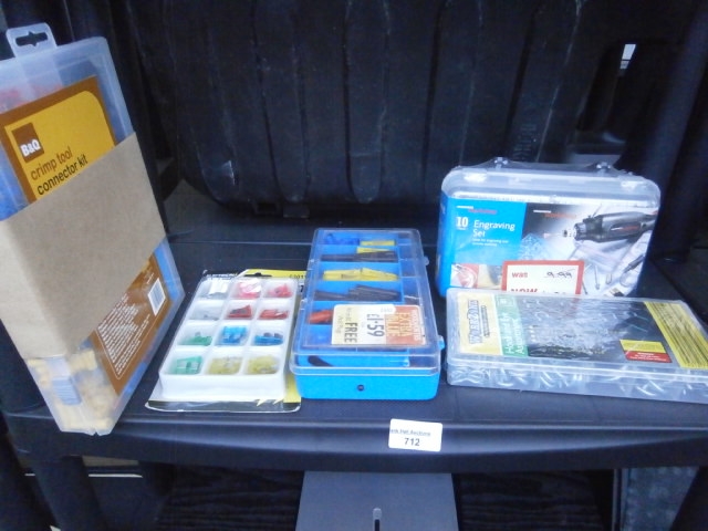 This lot contains multiple electrical and hardware kits, including a crimp tool connector kit, assorted fuses, electrical connectors, an engraving set, and small metal components.