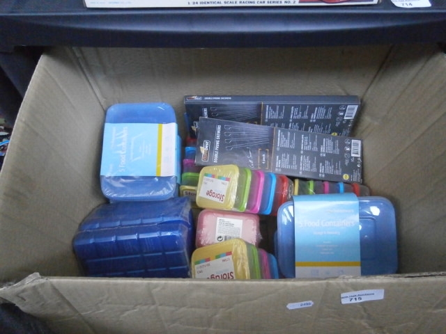 This lot features multiple plastic food storage containers in various sizes and colors, some with bands indicating “5 Food Containers” and “Storage & Heating”.