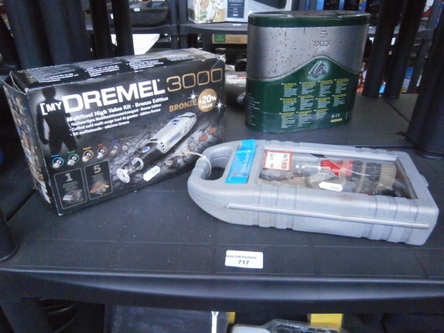 This lot features a Dremel 3000 Multitool High Value Kit – Bronze Edition in original packaging, alongside a cylindrical metal container and a grey plastic carrying case containing a Dremel tool and accessories.