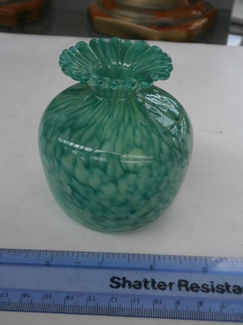 This is a small, round, translucent glass vase with a ruffled opening and a swirled green and white pattern.
