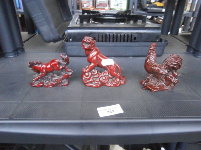 A collection of three glossy decorative figurines featuring a horse, a mythical creature, and a rooster, each on a distinct base.