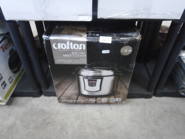 A boxed Crofton Professional electric multi-cooker with a silver body and black lid.