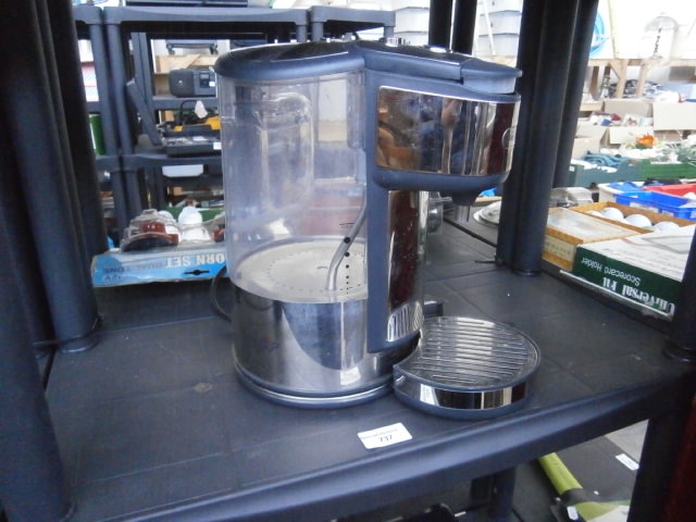A coffee maker featuring a clear plastic water reservoir, stainless steel base, and chrome accents.