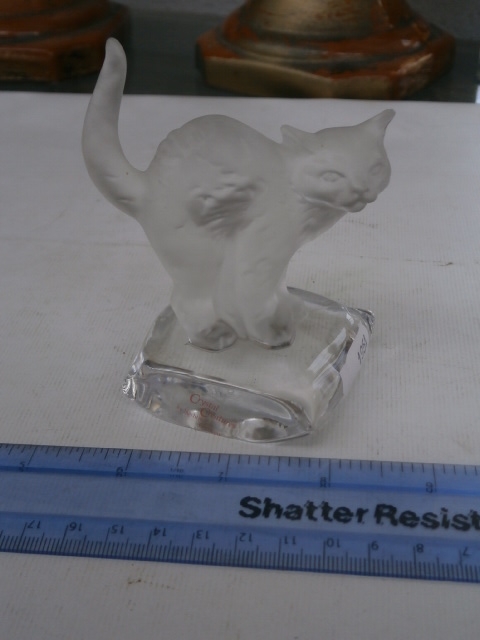 A frosted glass cat with its tail raised stands on a clear glass rectangular base inscribed with “Crystal” and “Cristallerie”.