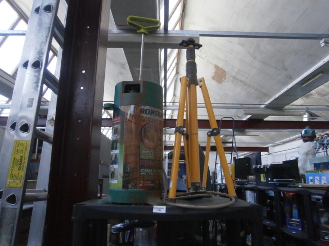 A Ronstan pressure sprayer with a metal rod and yellow handle, accompanied by a yellow tripod.
