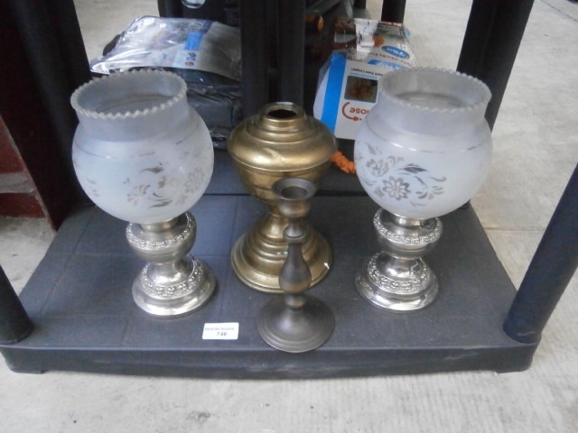 This lot features two frosted glass globes with etched floral patterns and metal bases, alongside a brass-colored oil lamp base and a dark metal candlestick holder.