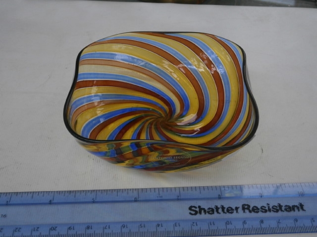 A square, multi-colored glass bowl with a black rim, featuring a swirling pattern and marked “Antonio Seguso Murano”.
