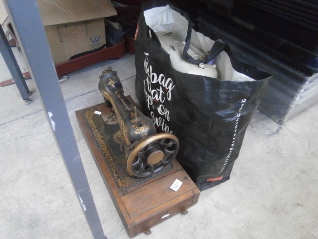A vintage black metal sewing machine with gold accents, mounted on a wooden base with a drawer.