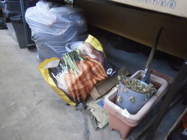 A brown plastic planter holds a metal bucket with dried plant matter and a small shovel, alongside a yellow bag of carrots and a black bag.