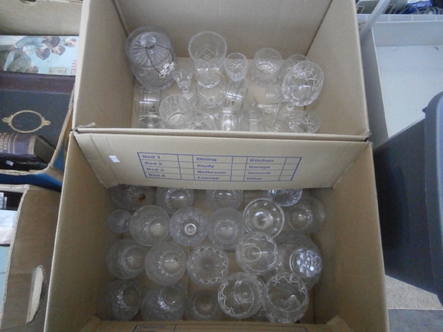 This lot features multiple clear glass items, including votive holders and small glasses, with some exhibiting cut glass patterns and ribbed textures.