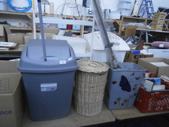 A dark gray, cylindrical plastic swing-top trash can with a silver handle and “50L SWING BIN” label.