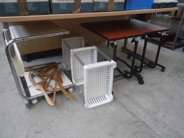 This lot features a metal and plastic rolling cart with a white basket and shelf, accompanied by two adjustable height side tables.