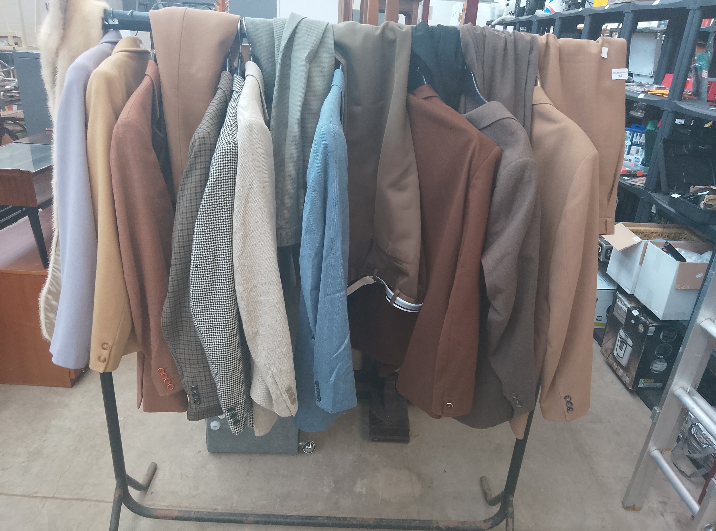 A collection of various men’s jackets and coats in different colors and patterns displayed on a metal rack.