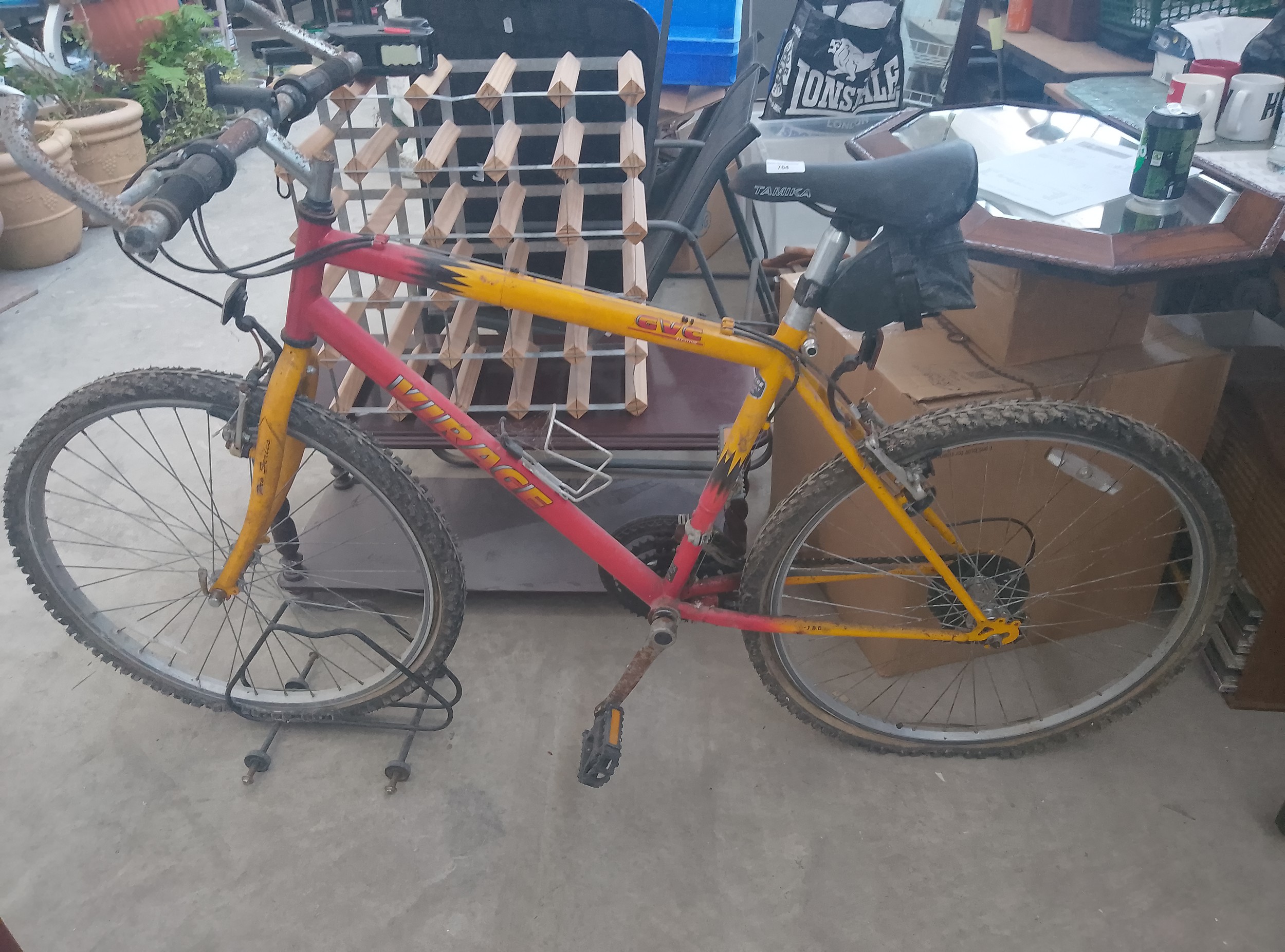 A red and yellow gradient frame mountain bike with “Mirage” and “GVC” branding, featuring a black seat and black knobby tires.