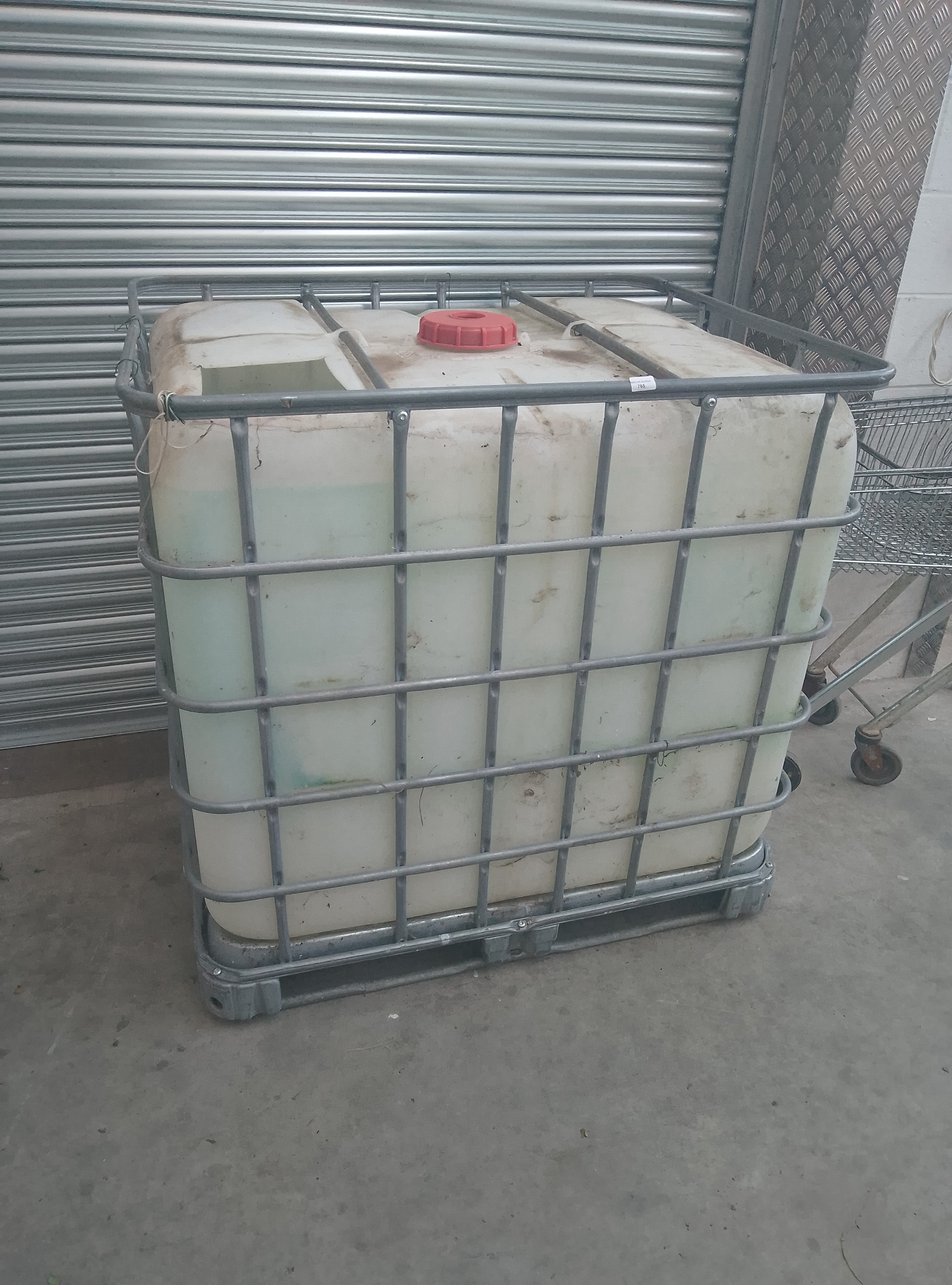 A large, translucent white plastic tank containing a light blue liquid, enclosed within a galvanized metal cage with a pallet base.
