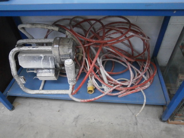 This is a paint sprayer unit with a coiled red hose, mounted on a metal frame with a ribbed handle.