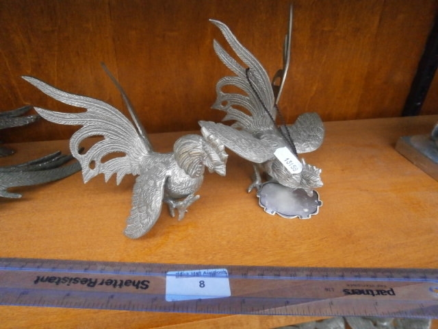 Two silver-toned metal decorative rooster figures are presented in dynamic poses.