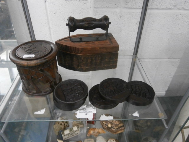 This lot features a wooden box with a metal handle, a carved wooden cylindrical container with a lid, and three carved circular objects.