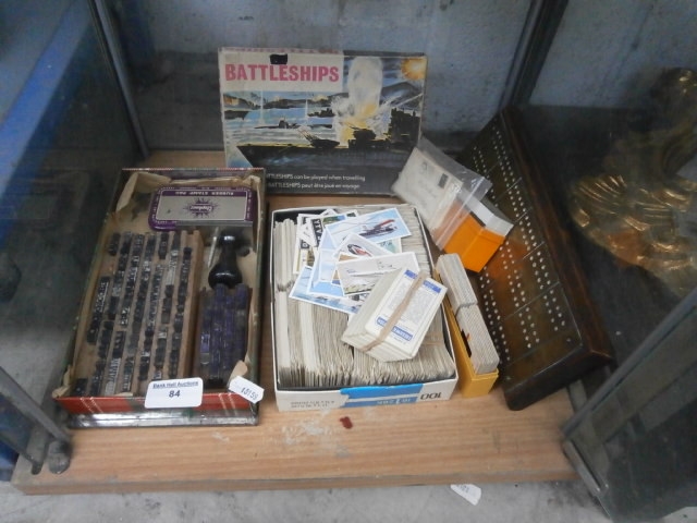 This lot contains a rubber stamp set, a collection of trading cards, and the board game Battleships.