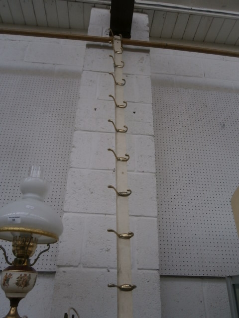A cylindrical, light-colored wooden coat rack featuring ten brass-colored metal hooks.