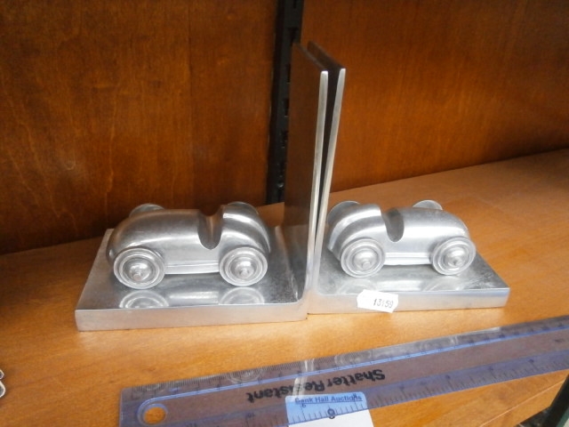 A pair of metal bookends, each shaped like a stylized car with a rectangular base.