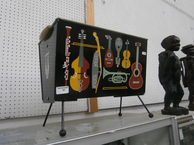 A rectangular metal plaque featuring colorful illustrations of various musical instruments, supported by three metal legs and a top handle.