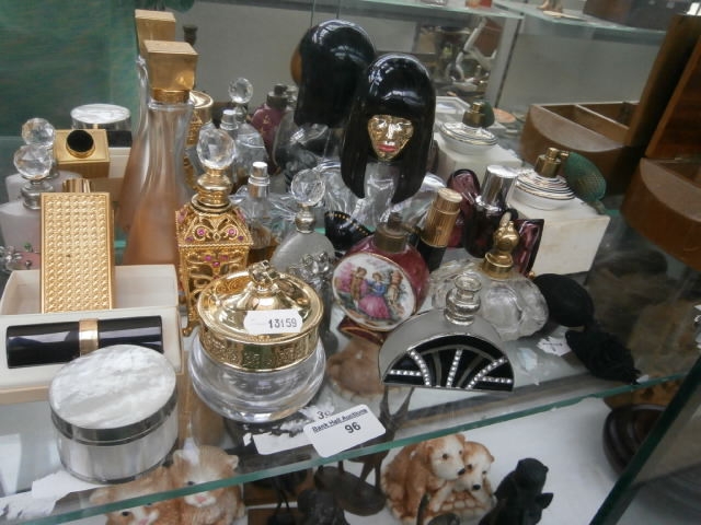 This collection features various decorative perfume bottles, atomizers, and cosmetic containers, including metal compacts and holders, glass bottles with ornate stoppers, and a fan-shaped atomizer.
