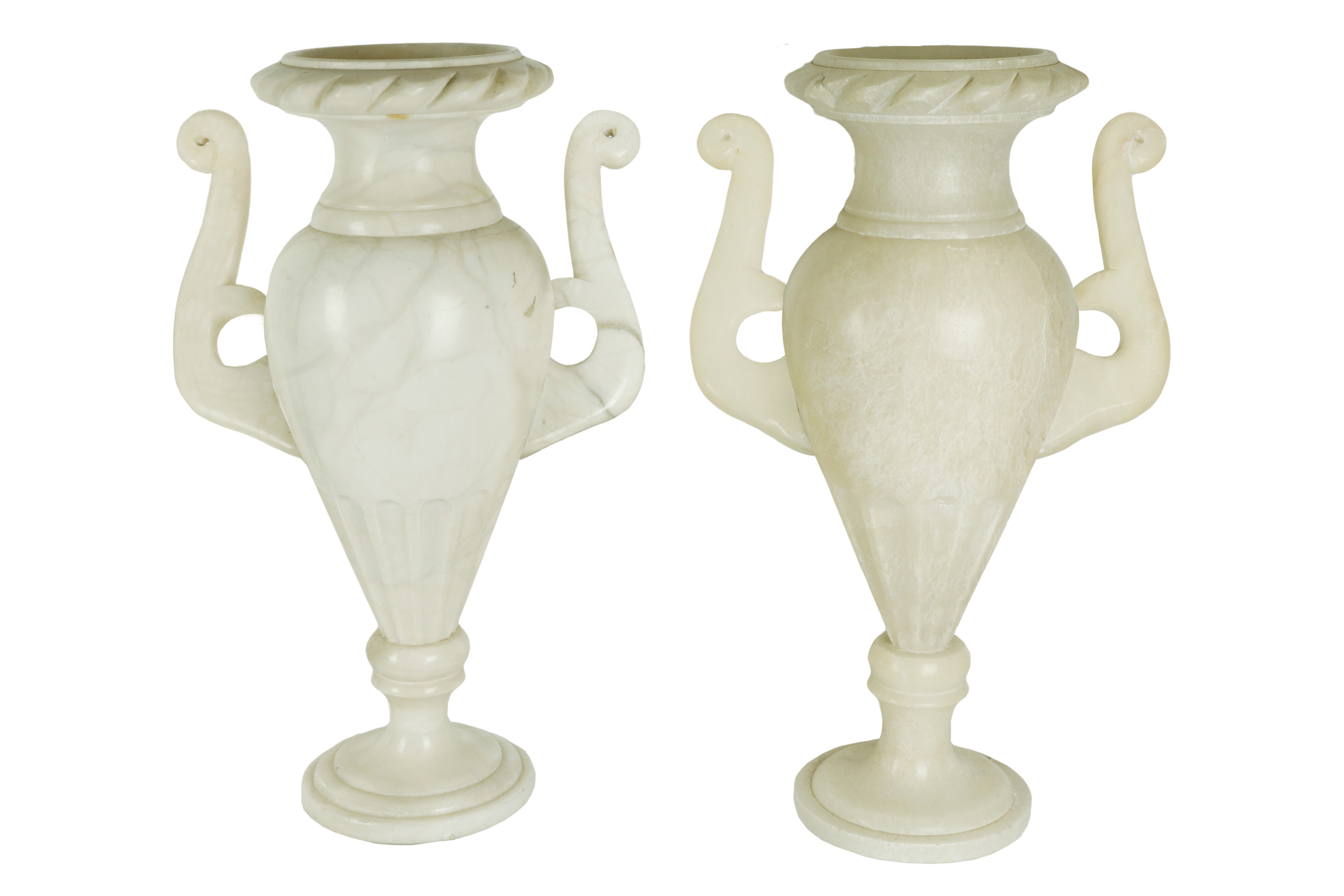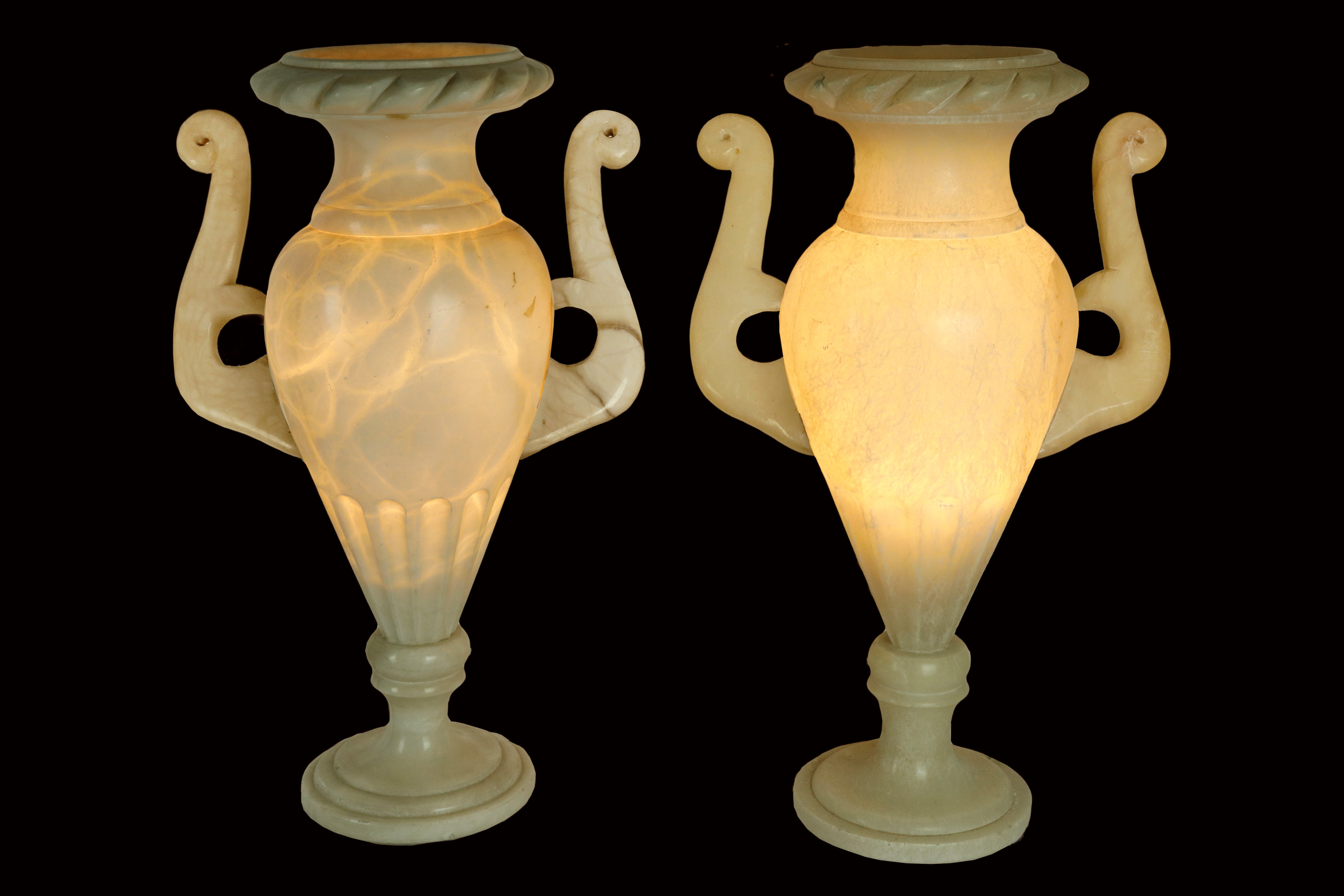 Coppia di lampade da tavolo in alabastro, realizzate a forma di vaso o anfora con due manici. Le lampade sono in stile neoclassico e risalgono agli anni ’30.