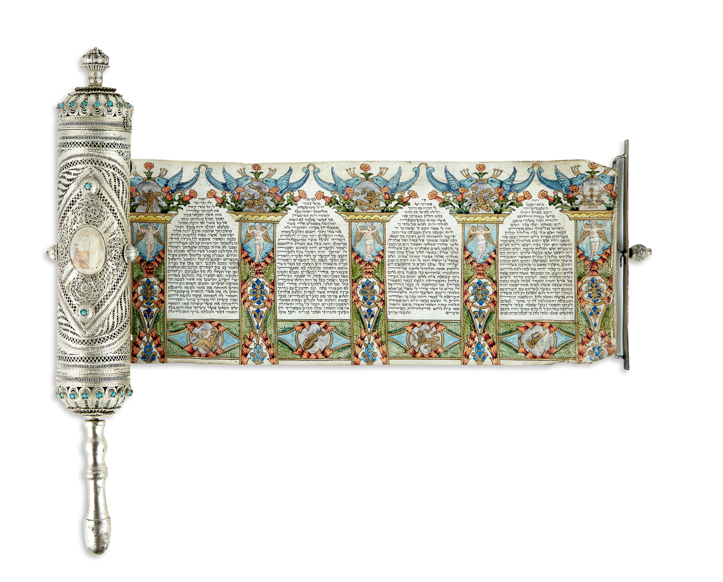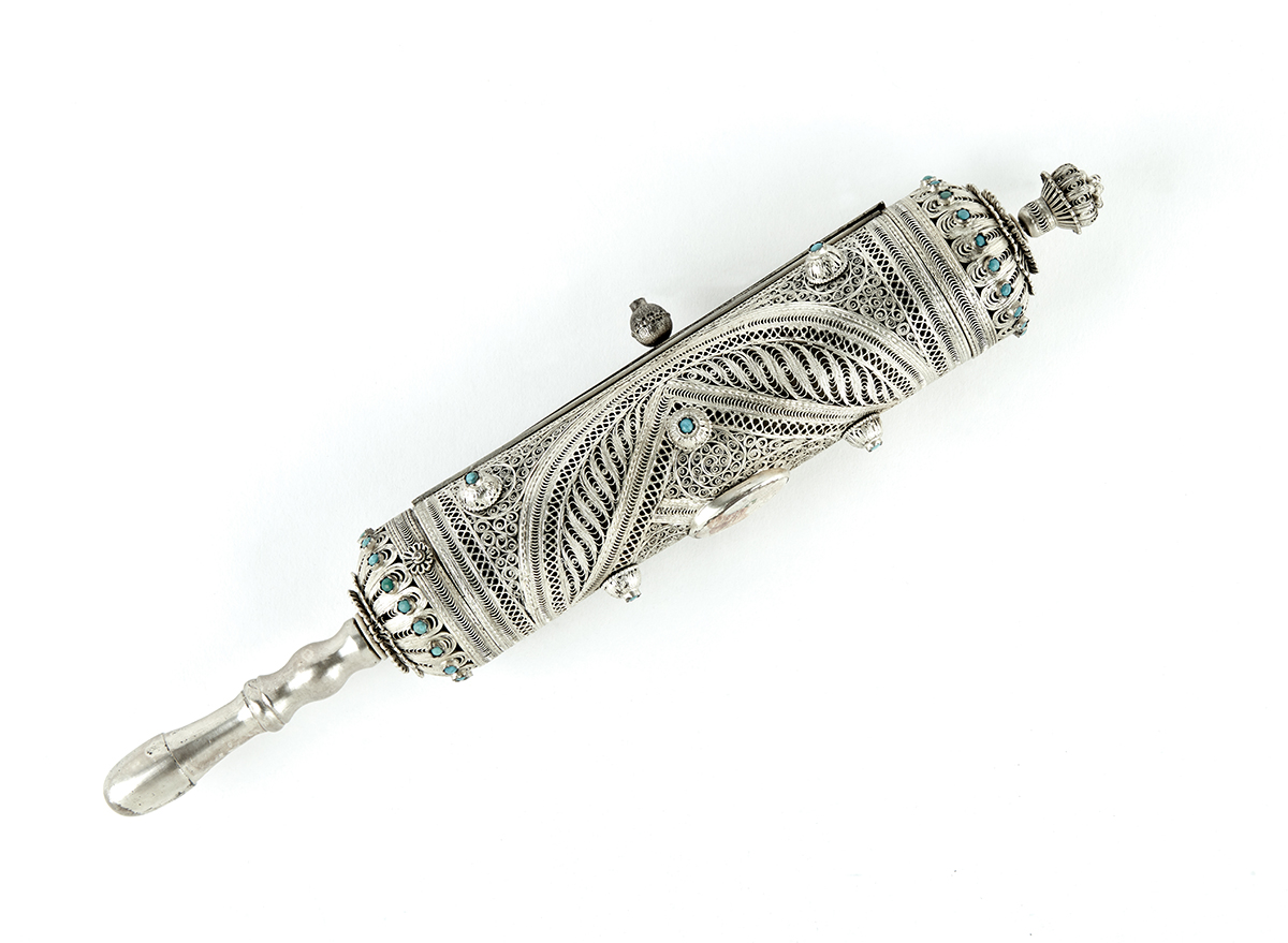 A Late 19th Century Georgian Megillah case crafted from silver and enamel, containing an Esther scroll. The book of Esther is notable as the only Bible book, besides the Song of Songs, that does not explicitly mention God.