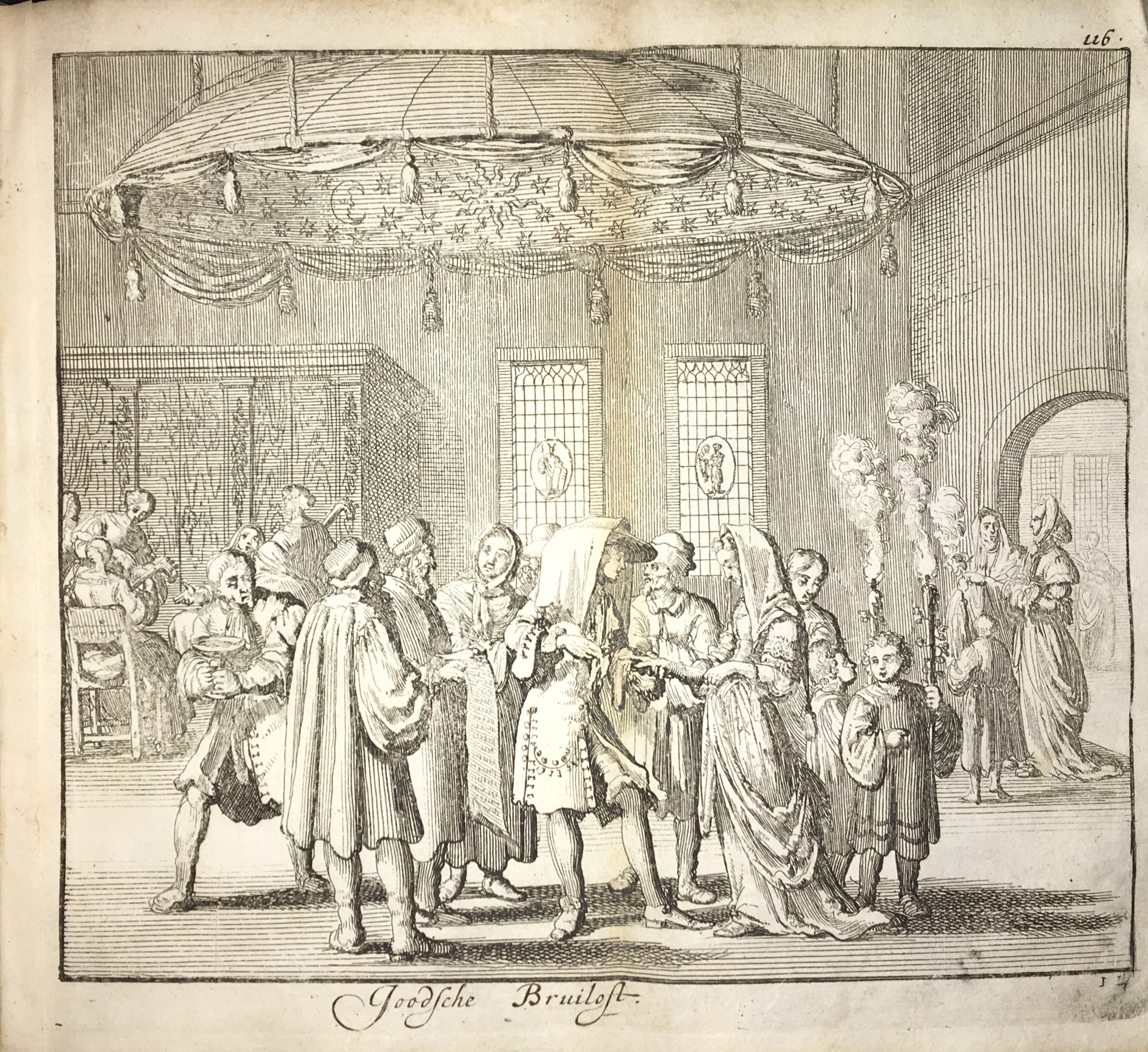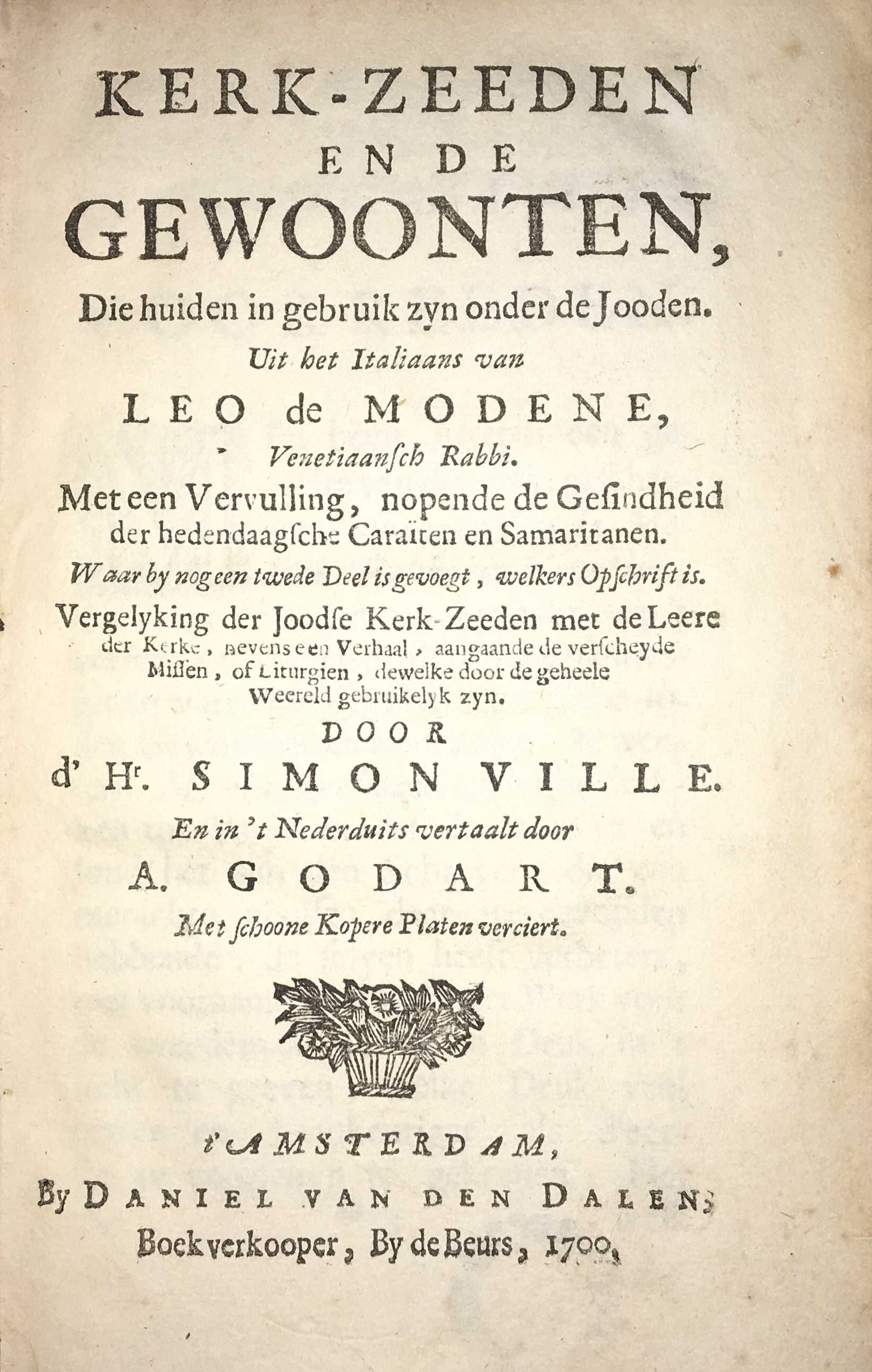 This is the first edition of the Dutch translation of Léon de Modene’s Historia degli riti hebraici, originally published in 1637. The Dutch translation, titled “Kerk-zeeden ende gewoonten die huiden in gebruik zijn onder de Jooden” (Church customs and habits that are currently in use among the Jews), was published in Amsterdam by Timotheus ten Hoorn in 1683. The translation was executed by Abraham Godart (fl. 1666-1683), a minor Utrecht poet, based on the French translation, “Cérémonies et Coustumes parmi les Juifs,” which appeared in The Hague in 1682. The volume includes a second part titled “Vergelyking de Joodsche Kerk-zeeden met de Leere der Kerke” (Comparison of Jewish Church Customs with the Doctrine of the Church) by Hr. Simonville, also translated into Dutch by A. Godart. The author, Leo de Modene, was a Venetian Rabbi, also known as Yehudah Aryeh mi-Modena.