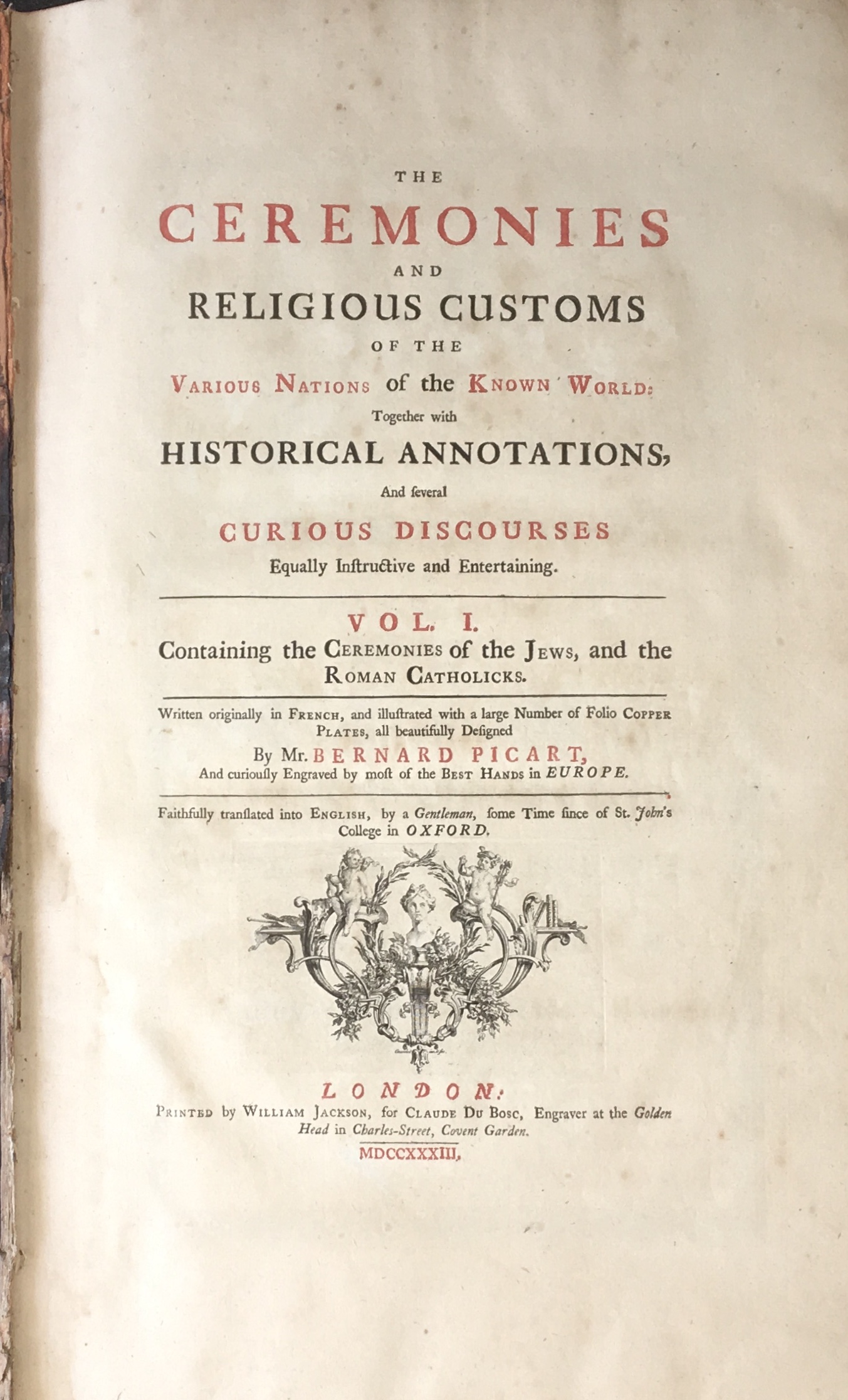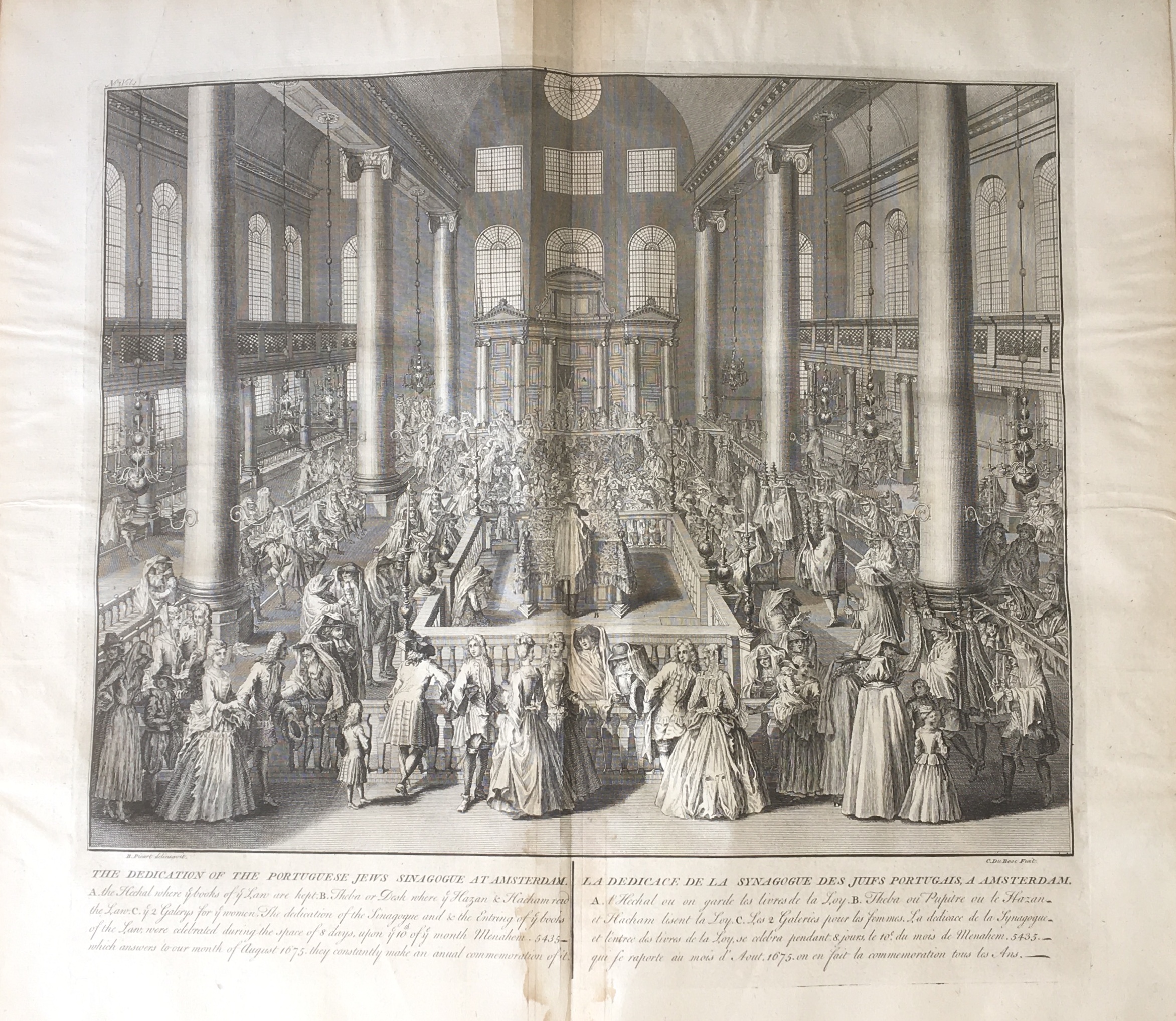 An engraving by Bernard Picart, dating from 1733. This piece depicts the dedication of the Portuguese Jewish Synagogue at Amsterdam. It is associated with “The Religious Ceremonies and Customs of the Several Nations of the Known World – Vol. I – Jewish Customs.”