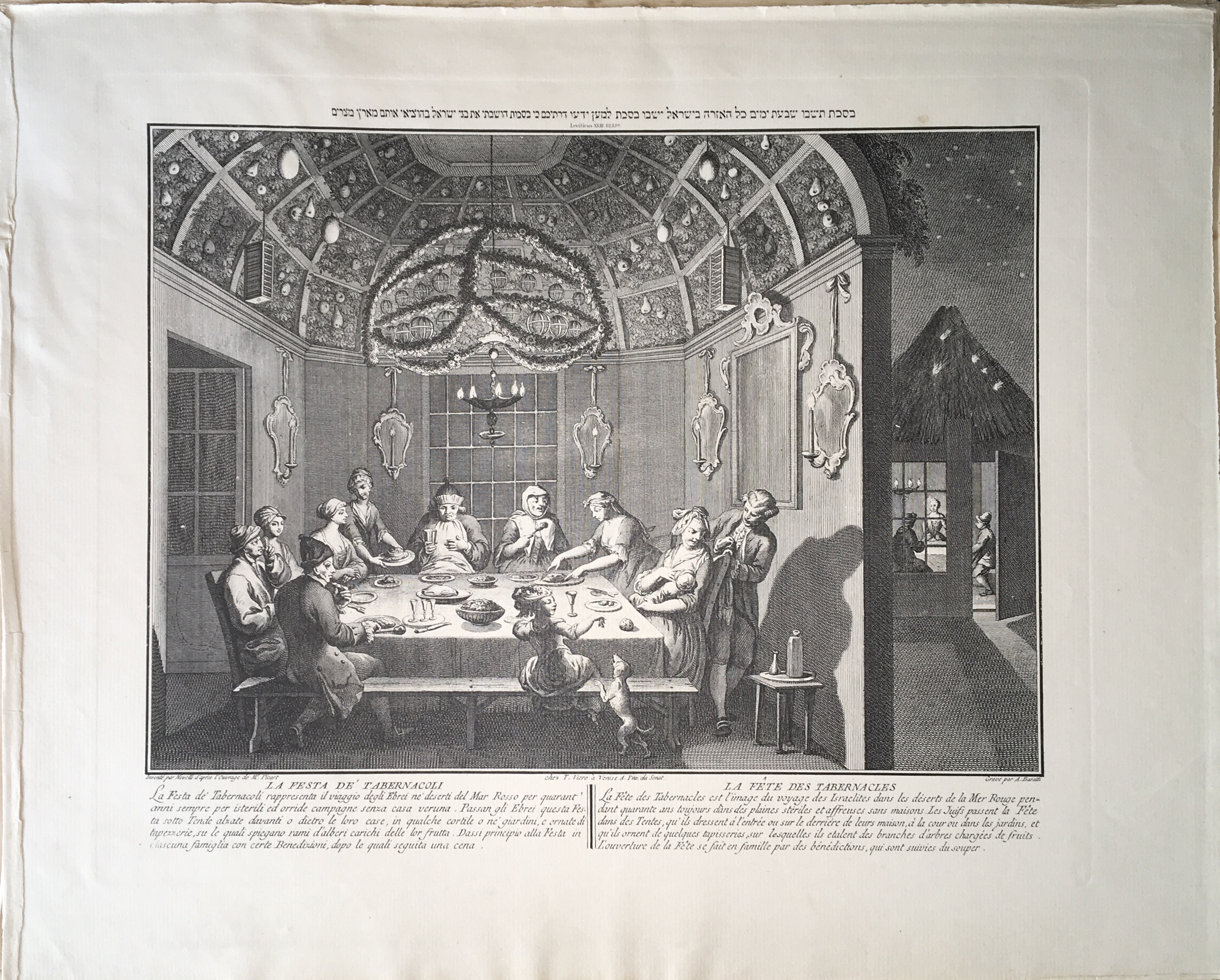 An illustration depicting a Jewish meal during the Feast of the Tabernacles, a great festival among the Jews. This work is after Bernard Picart, originally an illustration from “Religious Ceremonies and Customs” published in 1724. The item is identified as a print or reproduction.