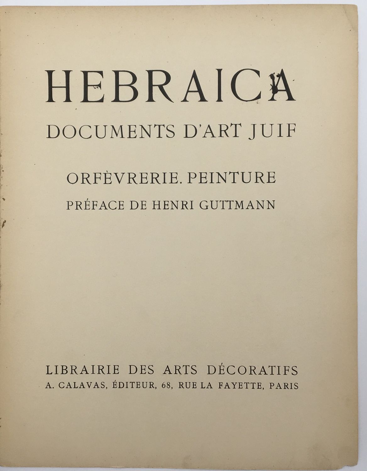 A publication titled ‘Hebraica Documents of Jewish Art Goldsmithing Painting’ with a preface by Henri Guttman. This is a first edition.