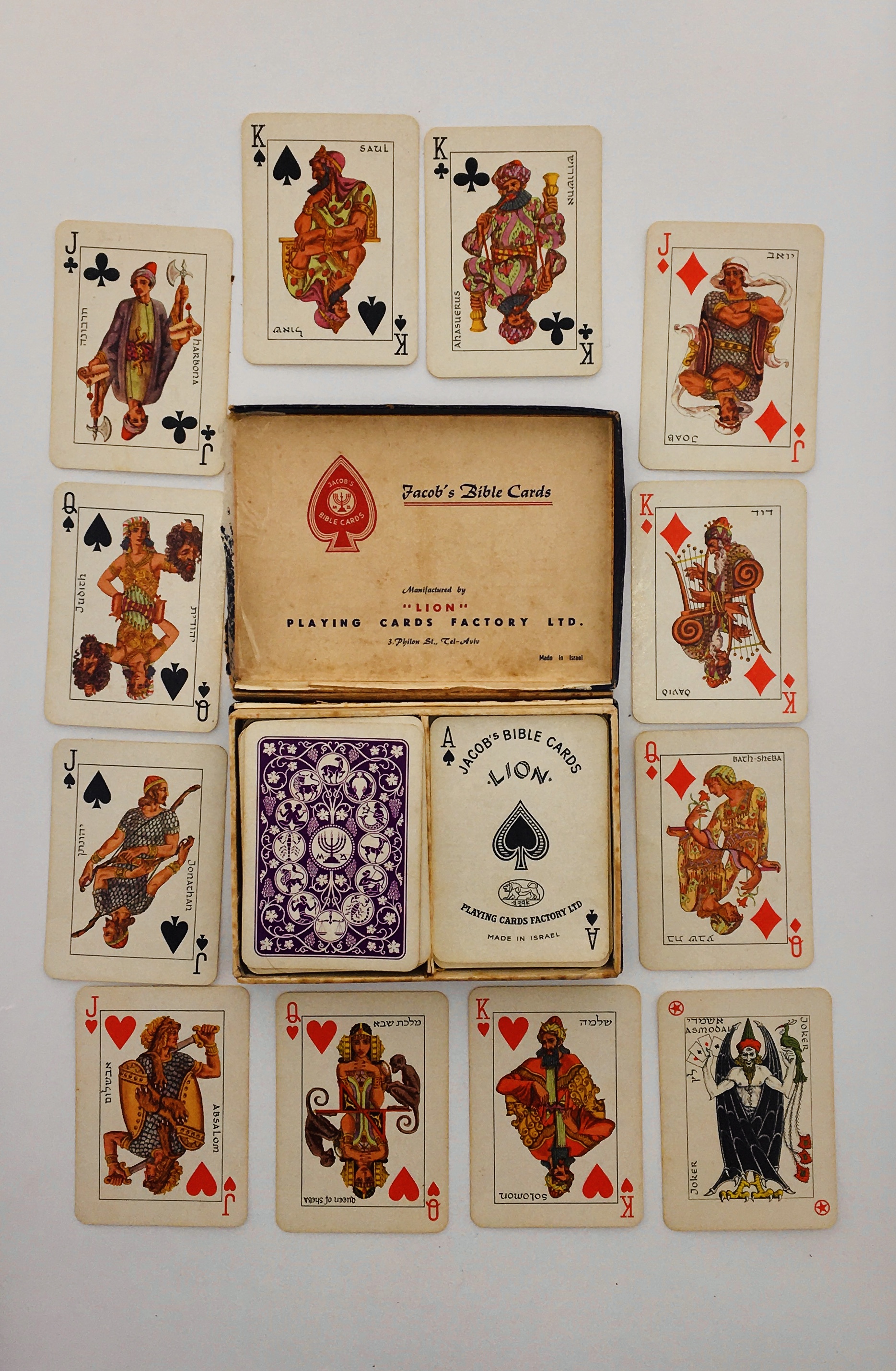 This vintage/antique single deck of Jacob’s Bible Playing Cards, identified as the ‘Philon’ series, dates to the 1920s or 1930s. The set includes its original box and jokers, making it a notable example for collectors of historical playing cards.