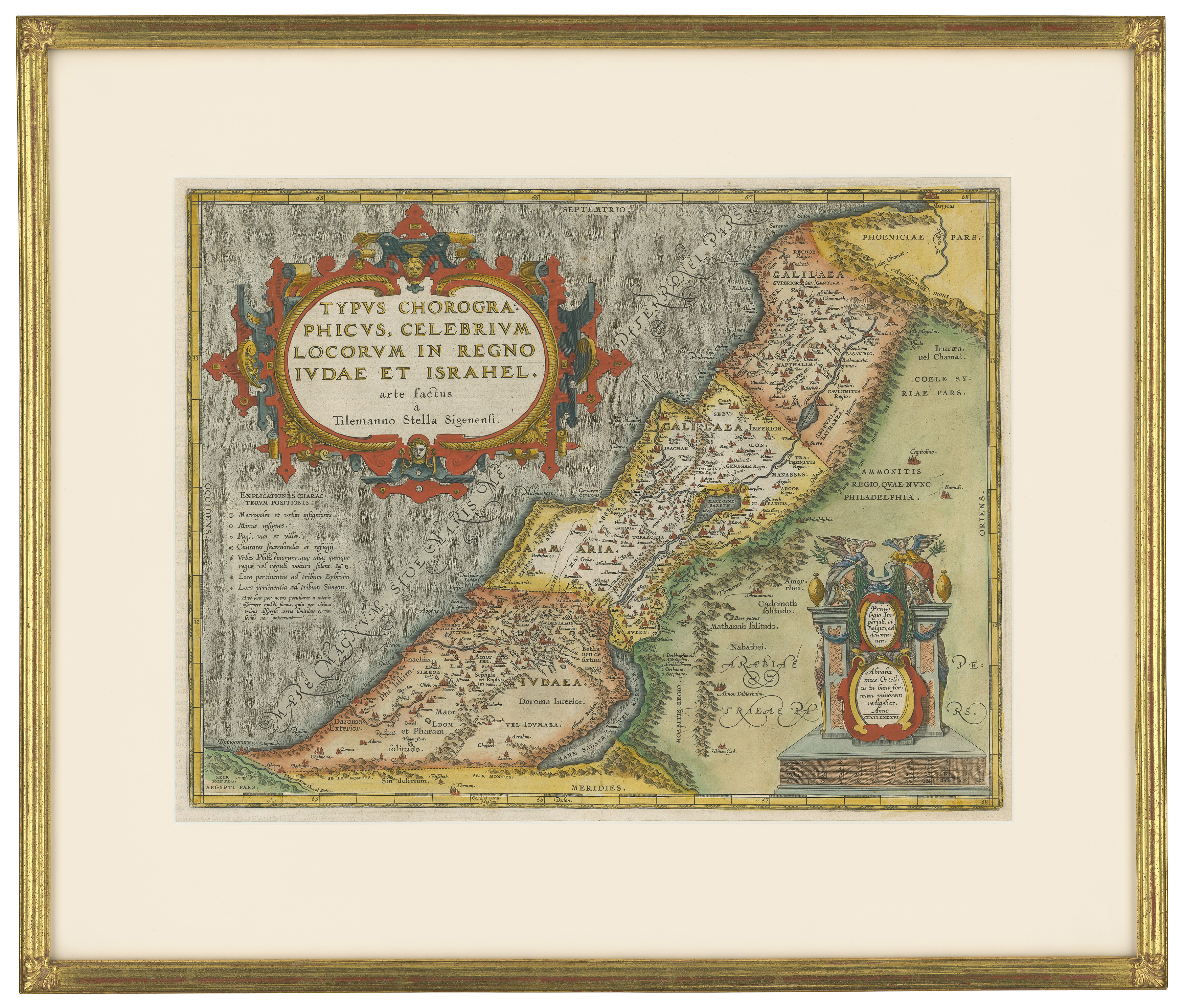 This item is a map by Abraham Ortelius, titled “Typus Chorographicus, Celebrium Locorum in Regno Iudae et Israhel” (Chorographic Map of Celebrated Places in the Kingdom of Judah and Israel). It dates to the late 16th to early 17th Century and is associated with ‘Theatrum Orbis Terrarum’. The map depicts the Kingdoms of Israel and Judah. It features two cartouches: one in the upper left containing the title, and another in the lower right with Ortelius’ dedication and scale bars. The reverse side of the map features Latin text and is without page numbering. No measurements or weight can be provided.