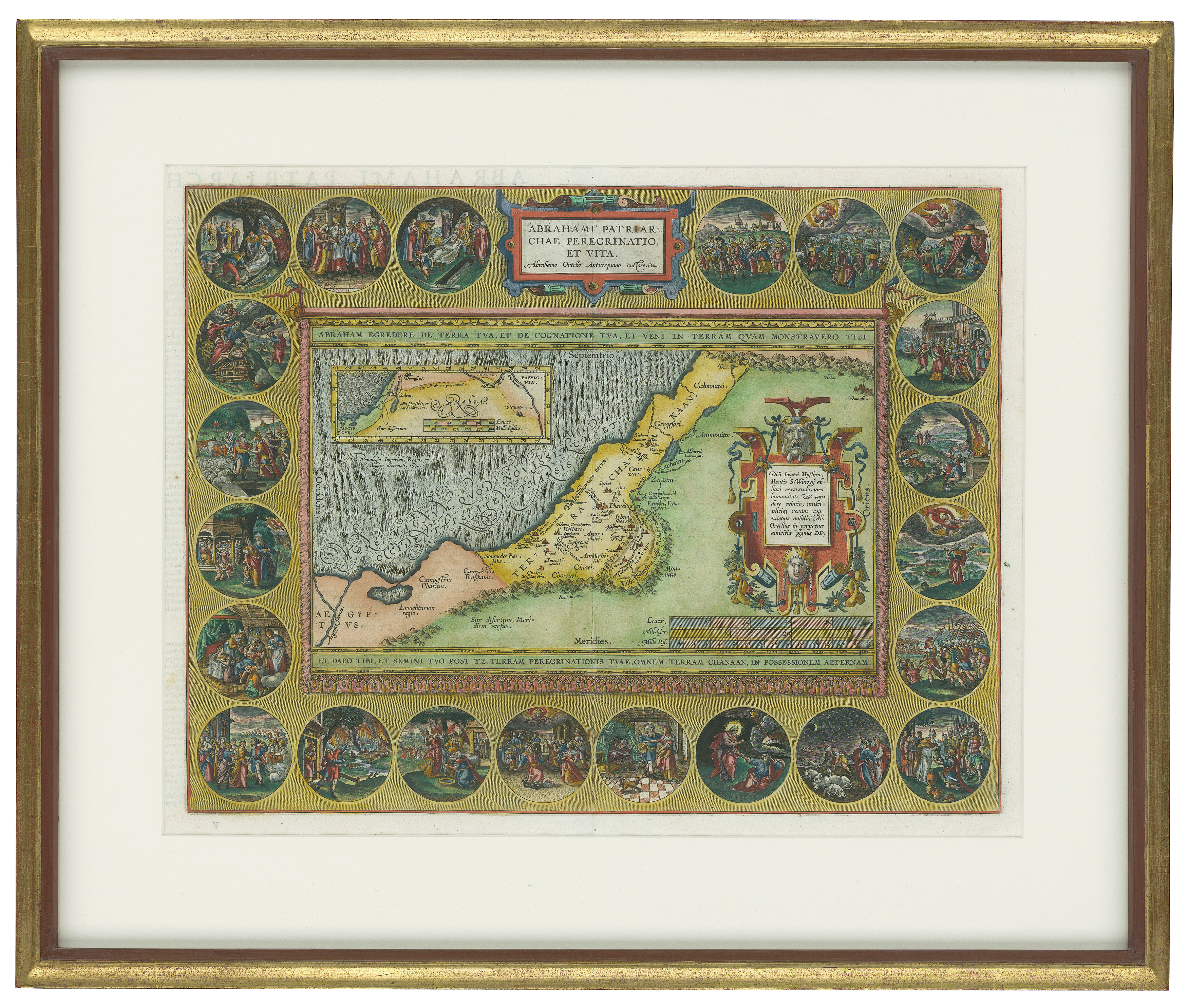 A historic map titled “Abrahami Patriarchae Peregrinatio Et Vita,” also known as “The Peregrinations of Abraham” or “Abraham’s Journey and Life.” It was crafted by the eminent Flemish cartographer Abraham Ortelius. One source indicates it is from 1603, from the ‘Theatrum Orbis Terrarum’. Another source states it was crafted in 1624. This decorative map is a cartographic achievement and a visual chronicle of the patriarch Abraham’s legendary journey in the Holy Land.